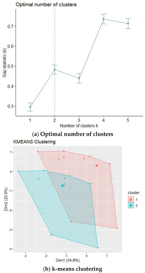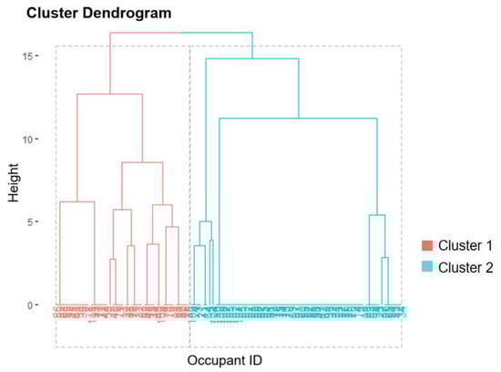 Clustering shows the optimal number of clusters for the time of raising action is two, which is shown in Figure 11a. Since there are five variables for the time of raising action (upon arrival, in the morning, at noon, in the afternoon and at departure), Figure 11b gives the principal component analysis, which was used to project the five variables into two main components to display the two clusters on a two-dimensional plane. The first component represents 34.9% of the original information while the second component represents 20.6%. The two cluster centers are listed in Table 4. It shows that the first center (first group) represents occupants with raising action at arrival, while the second center (second group) represents raising action during the presence in the office (after arrival). In Figure 12, the horizontal axis corresponds to the occupants (ranging from 1 to 141) ID numbers from survey participants, while the vertical axis represents the times of shade-raising actions; however, due to the large number of IDs, text overlap is unavoidable. But it does not affect the interpretation of the figures or the understanding of the article’s narrative. Figure 12 shows the cluster dendrogram, with 71 occupants in the first group and 40 occupants in the second, indicating most occupants raise shades upon arrival.