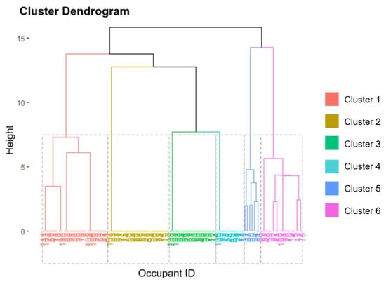 Consistent with the above situation, the horizontal axis of Figure 13 consists of the ID numbers of the 141 occupants. Due to the large number of IDs, text overlap has also occurred, but it does not hinder the continuation of the research. Similarly, six clusters were identified for the lowering action, as can be seen in Table 5 and Figure 13. The first group of occupants lowers the shades mainly in the afternoon, the second in the morning, the third at noon, the fourth at departure, the fifth both upon arrival and departure and the last group at noon and in the afternoon. Thus, the lowering action occurs with great diversity.