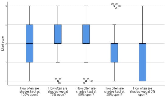 For the preferred shade positions (Figure 15), the Kruskal–Wallis test shows that the difference in frequency of shades at the five shade positions is significant (p value is less than 0.05, and the null hypothesis should be rejected) between 100% open and 100% closed, 50% open and 100% closed, 25% open and 100% closed, 100% open and 25% open, 50% open and 25% open and 75% open and 25% open. And there is no significant difference among 100% open, 75% open and 50% open. In addition, these three positions were preferred by occupants, indicating a higher probability for occupants to leave shades more than half open.