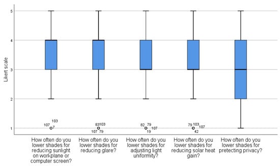 For the lowering action, the Kruskal–Wallis test shows that the difference in frequency of shade action caused by the five reasons is significant (p value is less than 0.05, and the null hypothesis should be rejected) between the first and third reasons, the second and third reasons, the second and fifth reasons, the first and fifth reasons and the fourth and fifth reasons (see Figure 16). By calculating the mean Likert scale of lowering reasons, it was found that the first, second and fourth reasons were the main reason for the lowering action and the second reason (reducing sunlight on the work plane/computer screen and daylight glare) occurs most frequently, followed by reducing solar heat gain and adjusting room light uniformity. Protecting personal privacy is ranked as the least frequent reason, which may be explained by the fact that office buildings require less privacy compared to residential buildings.