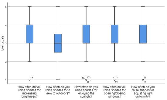 To understand how often occupants interact with shades and the frequency of possible reasons for shade actions, the Likert scale questions were used, since it offers a range of answer options from either end of the spectrum for the respondents to choose from. In this paper, most questions are designed on a 5-point Likert scale for satisfaction and frequency quantification (e.g., frequency-related questions have a 5-point scale from never, seldom, sometimes, often to very often, corresponding to a scale of 1 to 5). Due to the fact that the Likert scale is discrete and does not follow a normal distribution, ANOVA analysis is not suitable for such kind of data. Therefore, the non-parametric statistical Kruskal–Wallis test was considered to investigate whether there is a significant difference between the causes of shade adjustment. In addition, the non-parametric Spearman correlation analysis was conducted to reveal the relationship between questions. Employing these methods for research is both highly innovative and remarkably effective.