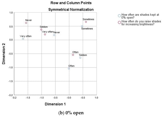 CA was also conducted to determine if there is a relationship between how often occupants keep shades at 100% open and the frequency of raising shades for increasing brightness (see Figure 18). The Chi-square test is 27.669, with a p value of 0.034, indicating that there is a relationship between the two variables. It can be seen that there is a similar trend for the two variables. For example, those who always raise shades for better brightness are more likely to leave shades 100% open. Similar analysis was conducted for the two variables “how often do you raise shades for increasing brightness” and “how often are shades kept at 0% open”. The Chi-square test is 35.657, with a p value of 0.003, indicating a significant correlation. The almost opposite trend was observed with “very often” for increasing brightness close to “never” keeping shades at 0% open. This means that those who raise shades frequently for increasing brightness more frequently leave shades fully open and less frequently fully closed.
