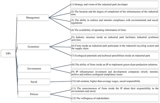 Regarding policy and regulatory considerations, two essential factors significantly contribute to the establishment or transition toward an EIP: (11) the consciousness of firms within the industrial park about their responsibility to the environment and society [26,37,42], and (12) the willingness of stakeholders such as businesses, management, communities [38], training institutions, experts, non-profit organizations, etc., to target the EIP model, which dramatically facilitates the creation or transition to the EIP model [26,28,29,37,42].