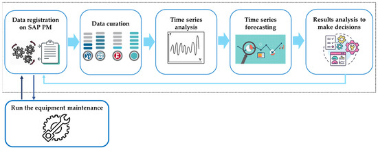 To implement predictive maintenance in a system managed by SAP PM, we followed a clearly defined workflow, as illustrated in Figure 1. The data from scheduled maintenance were regularly registered and managed in a database. This information was collected and curated to form a time series, which was then utilized for analysis and the application of statistical models. Three distinct time series models were employed to determine the most accurate forecasts. These forecasted outcomes are vital for decision-making and are recorded in the management tool based on the forecasts. This information was then used to facilitate equipment maintenance procedures.