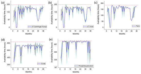 Maintenance historical time series obtained by the SAP PM register for each equipment family; the red line corresponds to the maximum operational availability time for (a) centrifugal pumps, (b) electromechanical hoists, (c) fans, (d) e-coat, and (e) phosphate passivation equipment.