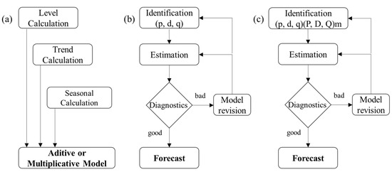 Algorithm schematic for (a) HWES, where the calculation result allows us to identify whether the model is additive or multiplicative; (b) ARIMA, which fits the model through parameters (p, d, q); and (c) SARIMA, which adds the seasonal component (P, D, Q)m to ARIMA parameters (p, d, q).