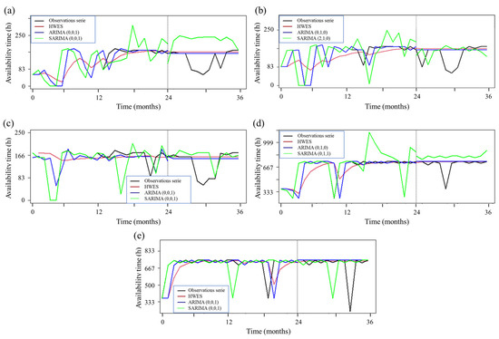Forecasting for the available time of an individual element of the equipment families (a) centrifugal pump, (b) hoists, (c) fans, (d) e-coat, and (e) phosphate passivation equipment. The parameters (p, d, q) were selected according to data fitting performance in ARIMA, and for SARIMA, the parameters (0, 1, 0) were added for the five families.