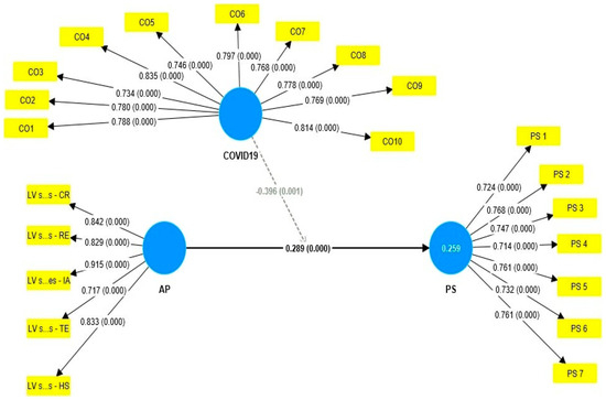 Table 3 displays the results of the reliability and validity of the lower-order construct of adaptive performance and the first-order constructs of project success and COVID-19. The internal consistency reliability of all the constructs was determined by both the composite reliability (CR) and Cronbach’s alpha. The values of these measures within the permissible range of 0.7 to 0.95 demonstrate the reliability of the constructs [63]. Any value beyond the 0.95 mark demonstrates that items are redundant and compromise construct validity [61]. Convergent validity refers to the degree of correlation between a measure and alternative measures of the same construct. There is ample support for all the constructs to have convergent validity, as the outer loadings of first-order constructs of adaptive performance were above 0.70 and the average variance extracted (AVE) of each construct was more than 0.50. Discriminant validity refers to the degree to which a construct is truly distinct from other constructs by empirical standards [61]. In this context, the estimate of the true correlation between two constructs is measured by the heterotrait–monotrait ratio (HTMT) of the correlations. The value of HTMT between constructs must be less than 0.85. Table 4 displays the HTMT values of all the constructs, which were less than 0.85, showing ample support for the establishment of discriminant validity. In addition, the values of the variance inflation factor (VIF) of the structural equational modeling were found to be less than 4, as displayed in Table A1 (see Appendix A). The VIF values above 5 indicate issues of collinearity. At this stage, there were no issues reported regarding collinearity.