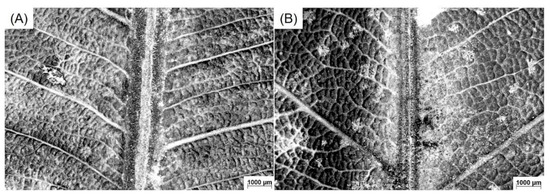 Leaves from Brazil nut trees from both communities had similar characteristics. Figure 2 illustrates the abaxial surface of leaves from Tukayá (Figure 2A) and Tukamã (Figure 2B).