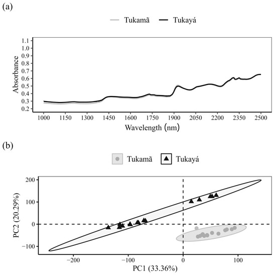 (a) Mean NIR spectra of Bertholletia excelsa leaves from two communities. (b) PCA score graph with mean second derivative NIR spectra of Bertholletia excelsa leaves from Tukamã and Tukayá.