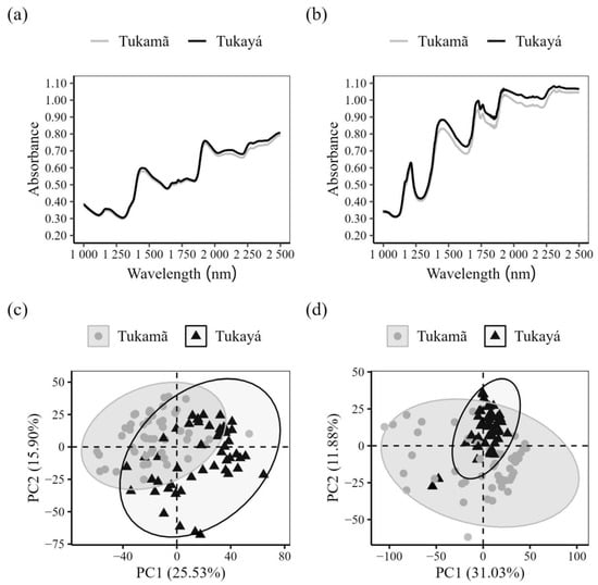 PCA of second derivative NIR spectra (Figure 4b) indicated that PC1 represented 33.36% and PC2 20.90% of total data variation from the two communities, and also indicated the separation of leaves based on origin i.e., Tukamã or Tukayá. Also, leaves from Tukamã had greater similarity, being more grouped in comparison to Tukayá.