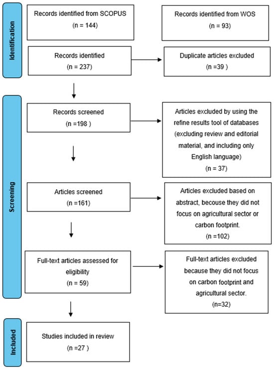The search on the Scopus and WOS databases led to 237 results, 144 for the former and 93 for the latter. From these, 39 papers were excluded as duplicates. Further screening was then carried out using the ‘Refine Results’ function of the databases in order to exclude reviews and editorial materials and include only articles written in English. A second screening was carried out based on the abstract content, excluding off-topic studies and those not focused on the agri-food sector or carbon footprints. In this way, 60 articles were assessed for eligibility through in-depth reading of the full text.
