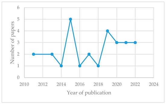 The descriptive analysis was carried out based on the distribution of the papers considered in the review, by year and country in which the case study was conducted, by the field of research application, by the main product under study and by the methodology applied in the establishment of the CF in the agricultural sector. To analyse the development of research in the field of CFs and to understand the trends in the scientific fields, the 27 selected articles are presented. As Figure 2 shows, they were published between 2011 and 2022. The results show an exponential growth in the number of papers published on this topic in the year 2015 and between 2018 and 2019. It is only in the last few years that scientific publication on CFs has been almost constant. The first publications date from 2011 to 2013, covering the CFs of butter and blends as well as different types of packaging and product waste at the consumer level []; the production and consumption of sliced bread []; the export of yellow melons produced in Brazil []; and the CF of bananas, following the life cycle along the value chain []. Only recently, in the 2015–2022 period, has the scientific community focused more on calculating CF using a life cycle approach. In order to counteract climate change phenomena, it is necessary to provide detailed information on agricultural practices and production that potentially generate a large amount of GHGs [], increasing the number of products analysed with this methodology.