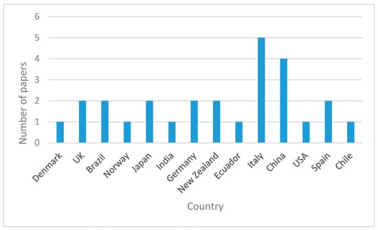 In relation to the place of publication, Figure 3 shows the geographical distribution by country. Of the works considered, 19% were published in Italy, followed by 15% in China. At the same percentage (7% per country) were the UK, Brazil, Japan, Germany, New Zealand and Spain. A lower percentage of publication can be found in countries such as Denmark, Norway, India, Ecuador, the USA and Chile with 4% each of papers on the topic in question. The country with the largest number of publications on CFs in the agricultural sector at the moment is Italy, which can be explained by the great interest shown by consumers in environmental issues and GHG reduction, as well as a greater willingness to pay for low-carbon food products [].