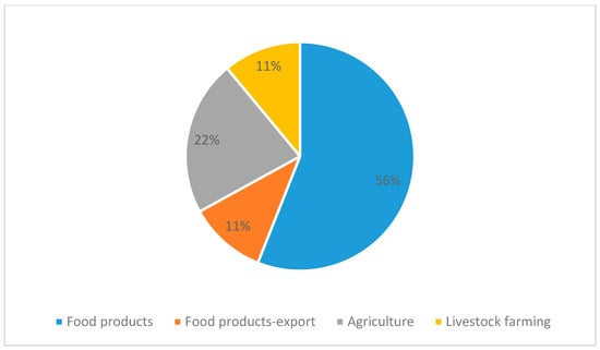 Figure 4 shows the results for the field of application of the research considered. The subject of food production, relating to the agricultural phase and the processing or sale of the product, is the one that receives the most attention, with a publication rate of 56%. Of the other articles analysed, 22% focus on the agricultural phase of production, while the remaining 22% is equally divided between research covering the livestock sector and the production of food products made for export to countries other than those of production. The increasing focus on food CFs demonstrates the need for knowledge about the impact of food on climate change []. The study of the impact of agricultural processes offers the possibility of combining CFs with the methodologies applied in the study of carbon sequestration in order to better account for production and suggest to farmers the best practices that can be implemented to reduce impact and increase carbon sequestration []. In relation to the livestock sector, which is also responsible for GHG emissions, the application of CFs makes it possible to define the best type of livestock farming in order to revitalise the rural environment while maintaining an adequate level of profitability []. Another important topic, still little explored in the existing literature, is the production of food for export, compared to numerous studies covering the entire cycle of the product produced and consumed in the same country. The analysis of the entire supply chain makes it possible to identify hot spots and measures to be taken in exporting countries [].
