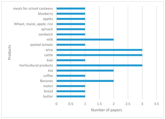 Figure 5 shows the products considered in the reference literature. It can be seen that a great deal of interest was found in the wine sector [,,], livestock [,,] and different horticultural products [,]. Other work on fruit and vegetables considers crops such as melons [], bananas [,], kiwi [], tomato [], spinach [], apples [] and blueberry []. Several studies have been conducted on milk, one of which deals with the comparison between milk of animal origin and plant-based milk [,]. The review also contains work on products such as butter [], tea [,], coffee [], bread [], sandwiches [] and meals for school canteens []. One paper deals instead with different products such as wheat, maize, apples and rice [].