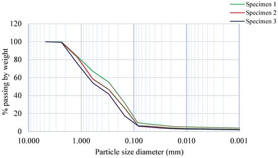 After conducting preliminary tests for gradation and plasticity evaluation, it was determined that the local soil in Belen, New Mexico, as indicated in Table 1, was the most suitable choice, which showed larger plasticity and was used for the rest of this study. The size distribution of three different soil samples of S6 is depicted in Figure 1.