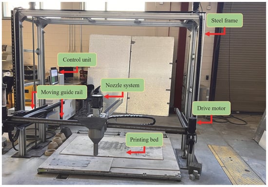 A gantry-type printer with a steel frame of 2 m × 2 m × 2 m was used for printing, as shown in Figure 5. The printer used G-code, a programming language that converts the 3D model into slices and prints them layer by layer. Throughout the research, printing parameters such as extrusion speed, printing speed, soil matrix mixing speed, nozzle size, layer height, and layer width were kept consistent, as shown in Table 3. However, a nozzle with a diameter of 20 mm was used in this study. This size was chosen based on the fiber length, as determined during preliminary investigations. The printing temperature was maintained at 23 ± 2 °C.