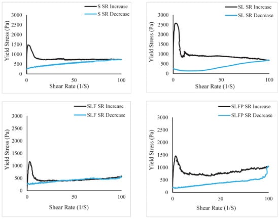 Similarly, the rheology characteristics of the soil mixes were studied using a Brookfield rheometer, as shown in Figure 4b. The test was performed for a hysteresis method. This method has been previously used for cementitious mixes [53,54,55] and was accurate for soil used in this study. Once the materials were thoroughly mixed, the fresh mix was immediately poured into a cylindrical plastic cup and subjected to shear using a rheometer with a shear van spindle. The shear rate was applied from 0 S−1 to 100 S−1 in 60 s, and gradually decreased from 100 S−1 to 0 S−1 in the other 60 s.