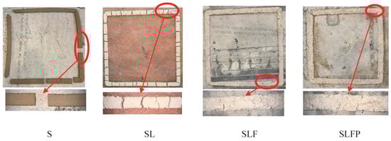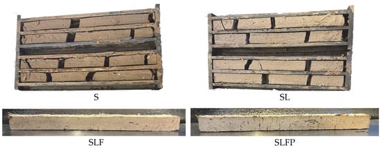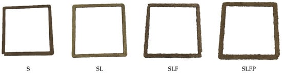 Figure 11 and Figure 12 illustrate the shrinkage and cracking patterns observed in dried cast prisms and printed hollow squares. The substantial drying shrinkage in S and SL prisms led to their failure, characterized by extensive visible cracks, as shown in Figure 11. A similar trend was evident when these mixes were 3D-printed, as depicted in Figure 12. Hence, the significant cracking and drying shrinkage observed in S and SL mixes were deemed unsuitable for construction purposes. The substantial shrinkage observed can be attributed to the presence of 15% nontronite clay mineral in the local soil. Nontronite, characterized by its unstable structure, is susceptible to both swelling and shrinking phenomena. This mineral possesses a layered structure, facilitating water absorption and expansion. When water infiltrates between these layers, nontronite swells, causing an increase in volume. Conversely, when deprived of water, it undergoes shrinkage, contributing to the observed shrinkage in the soil [61].