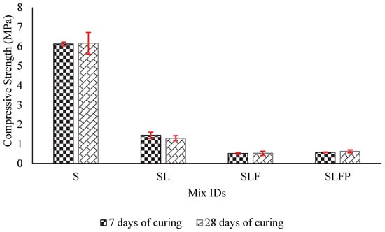 The compressive strength of the cube specimens of size 50 mm × 50 mm × 50 mm was studied according to ASTM C109 [56], as shown in Figure 4c. The cube specimens were cast in two layers and compacted, and their strengths were measured after 7 and 28 days of curing. The materials were air-dried after casting and subsequently cured to enhance the reactivity of lime. The curing was carried out in a humidity-controlled room wherein the specimens were not directly in contact with the water vapor. It was covered in a polythene sheet, proving small pores to have a hydration process. The load compressed the samples at 1 mm/minute in the compression tests. The compressive strength was calculated as the axial force per unit area of the contact surface of the cube specimen. Efforts to 3D-print cubic structures of this size or larger, with the intention of later cutting them into smaller pieces, were unsuccessful in this study. All the samples experienced cracking before testing; therefore, 3D-printed specimens were unsuitable for conducting compressive tests.