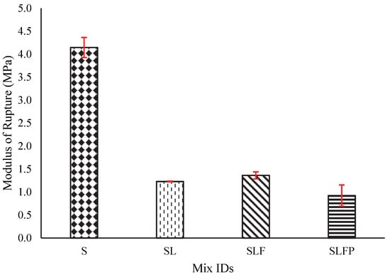 The modulus of rupture (MoR) for the printed prisms of size 160 mm × 40 mm × 40 mm was tested following ASTM C293 [57] after 28 days of 3D printing after curing in the same condition stated for compressive strength. The prisms were initially printed with a size of 200 mm × 40 mm × 40 mm, but the prism was cut to make support to support a distance of 160 mm. This examination was conducted using a universal testing machine equipped with a three-point bend fixture, as shown in Figure 4d. The loading was applied in the middle span at a 0.5 mm/min strain rate. The modulus of the rupture was calculated according to the equation below.