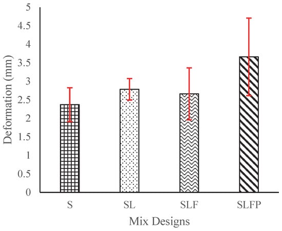- Evaluating the deformation in the bottommost layer filament of the same single-filament wall, which was printed with a maximum of 12 layers after drying, the results of which are illustrated in Figure 19 and Figure 20. The S mix exhibited the least deformation, while the SLFP mix had the highest average deformation in the lowermost filament layer, 3.67 mm. This deformation was over 50% greater than that observed in mix S. Furthermore, the results obtained from the flow table tests indicated that the SL and SLFP mixes had significantly higher flow values than S and SLF mixes. The outcomes of this evaluation align with the number of stackable layers in Table 8, where larger deformations in the lowermost layer corresponded to shorter single walls and fewer stackable layers. Furthermore, Figure 19 illustrates the 3D printing quality after the fresh mix has undergone drying. As previously noted in the extrudability section, the S mix exhibits the highest printing quality following the drying process.