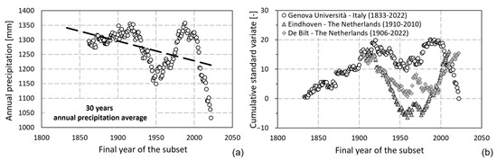 The cumulative standard variate is shown in Figure 2b, with two additional annual time series included for comparison, measured at two sites in the Netherlands for which centennial rainfall records are available. These data show opposite behavior to the series recorded at the University of Genova, suggesting that the observed recent minimum in annual rainfall totals in Genoa may be a local rather than a general feature. In the graph, for readability, a fictitious match between the values of the standard deviate in the initial year is assumed, which does not change the comparison of the recent trend sign.