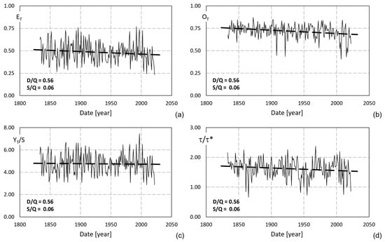 Annual variation (thin grey lines) of the performance indicators: (a) overall efficiency ET, (b) overflow ratio OT, (c) usage factor YT/S, and (d) normalized detention time τ/τ*. The thick black dashed lines represent the linear trend of each time series.