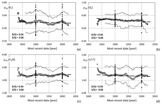 Thirty-year moving average (white diamonds) of the performance indicators: (a) overall efficiency ET, (b) overflow ratio OT, (c) usage factor YT/S, and (d) normalized detention time τ/τ*. The grey diamonds indicate initial values, which were based on a small sample, while the black diamond depicts the most recent year’s value. The thin lines encompass 80% of the sample for each year, with black dots indicating the annual values for two sample years, which correspond to the centennial dates. The thick black dashed line indicates the linear trend.