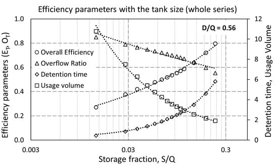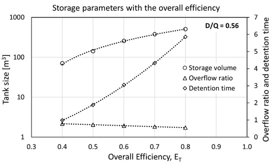 Changes of the storage parameters with the overall efficiency, including tank size, overflow ratio, and detention time, under a fixed demand fraction D/Q = 0.56.