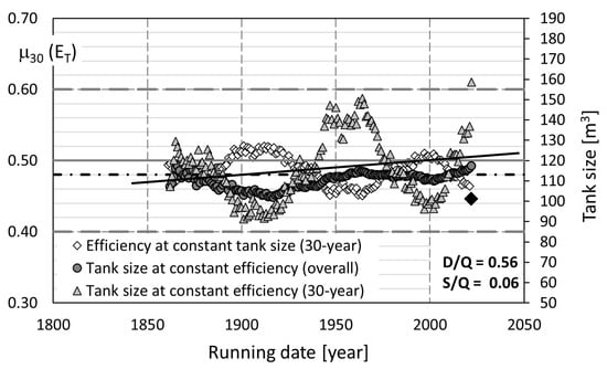 The resulting time series are shown in Figure 8, along with the thirty-year moving average of the overall efficiency based on a fixed tank size of 120 m3 (as in Figure 5a). The calculated mean value of the overall efficiency at S = 120 m3 is ET = 0.48, and we have calculated the tank volume required to achieve a target value of 0.48 in each reference period, whether the overall series since 1833 or the moving average over subperiods of thirty years.