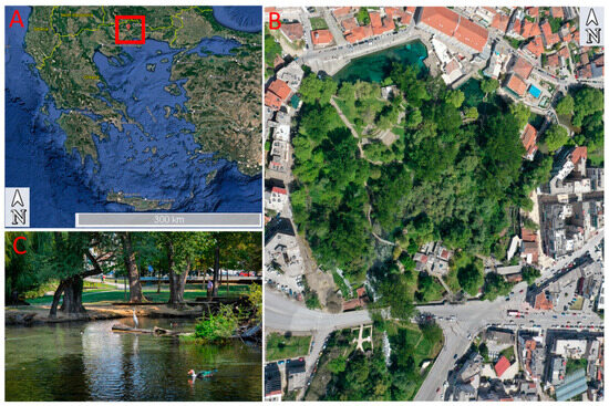 Drama is the capital of the Drama Regional Unit. It belongs to the Eastern Macedonia and Thrace Region located in Northern Greece (see Figure 1). The city was originally named Ydrama or Dyrama because of the abundant water sources (e.g., springs and streams). The city of Drama has an area of 59 km2 and an altitude of 118 m above sea level. The population of the city is approximately 44,257 people, based on the population’s census of 2021 [41]. The Köppen-Geiger climate classification is Csa (typical Mediterranean climate). The average temperature in Drama is 14.2 °C, and the precipitation is 520 mm yr−1. Recently, there have been efforts to exploit the unique natural ecosystems that are in or surround the city for ecotourism opportunities. An example is the environmentally friendly development of Agia Varvara Park. The Agia Varvara Park (or Saint/Ayia and Barbara/Varvara) is a recreational riparian area that includes a natural pond, natural underground springs, and a perennial stream and is located in the city center (WGS84: 41.149324, 24.141168) (Figure 1). The stream has its lowest flows during the summer months, while the highest have been recorded from February to April. The area showcases high flora and fauna biodiversity, and efforts need to be made to conserve this unique ecosystem. Agia Varvara Park (from this point on) is the most naturally maintained riparian area in an urban setting in all of Greece [26]. It should be used as a successful example of an urban NbS that could be applied to other towns in Greece, the Balkans, and the Mediterranean.