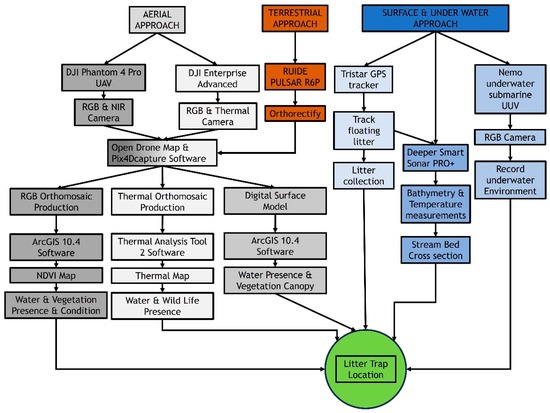 Urban riparian areas in Greece have not been studied extensively, despite their importance in maintaining sustainable cities and mitigating climate change impacts [26]. This study presents the first application in Greece of different new approaches based on new technologies (different UAVs and cameras, a UUV, a sonar, and a GPS tracker) in the urban riparian area of Agia Varvara Park. This is a unique, well-maintained natural riparian ecosystem within the urban fabric of Drama City. The first aim of the study was to assess and map Agia Varvara Park by showcasing the use of new technologies that will allow more quick and/or accurate estimations of different environmental variables. These variables could be utilized by the land and water managers to better understand the current condition and enable them to sustainably manage and implement nature-based solutions. The second aim was, based on some of these variables, to determine optimal opportunity sites to install litter traps. The frequent visitation to the park has led to plastic litter being a major problem, especially during certain events.