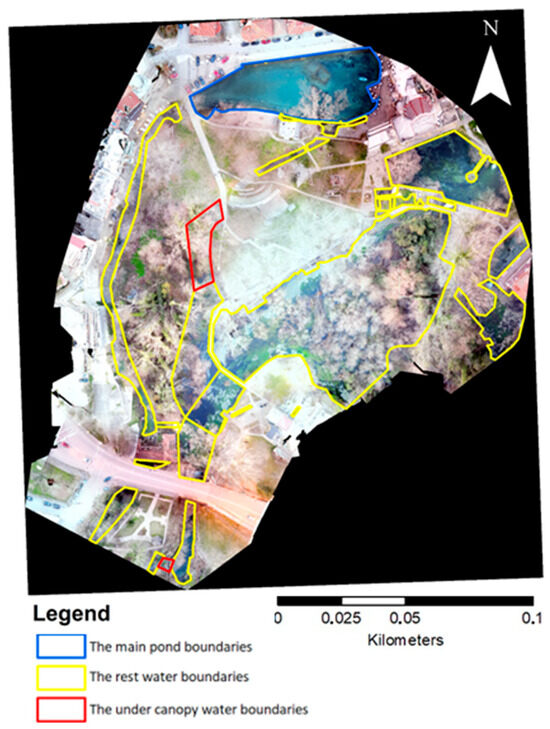 The images of the UAV flights enabled us to produce the RGB orthomosaics in the Pix4D software of the studied park and estimate its general characteristics. Through the orthomosaic map (Figure 4), the perimeter (235.6 m) and area (2298.0 m2) of the main pond of Agia Varvara were calculated. This is the proper area where the miniature boats during the celebration event should be placed (blue boundaries in Figure 4). The GPS/GNSS topographic survey estimated a perimeter of 238.8 m and an area of 2309.7 m2. The estimates based on the RGB orthomosaic calculations were very close to the field measurements by the GPS/GNSS. The perimeter and area of the rest of the water surfaces (see yellow boundaries) according to the RGB orthomosaic (including the other ponds/streams) were estimated at 2168.3 m and 11,737.1 m2, respectively. An area of 454.46 m2 with a perimeter of 128.40 m that also represents water surfaces was not captured in the specific orthomosaic because of the vegetation canopy. This missing area was captured by the topographic survey (see red boundaries). The total actual area of the water surfaces in Agia Varvara Park is 14,489.6 m2.