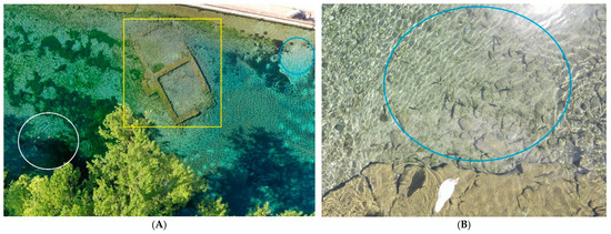 Airborne captured images from the DJI drone Mavic Enterprise Advanced: (A) the old ruins of Agia Varvara church (yellow square), ducks and swans (in the white circle), and fish (blue circle); (B) a close-up of the fish and a duck.