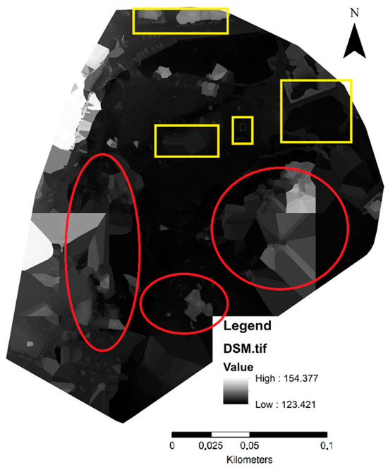 The DSM also allows the delineation of human construction and recreation areas (yellow squares) (Figure 6). These structures have easily recognizable patterns (aligned, rounded, or squared forms). The boundaries of the captured image are not of high accuracy. For highly accurate elevation measurements, the UAV should have flown at lower altitudes and also captured oblique angles that were impossible due to the electricity wires and the surrounding buildings. This is a very common and expected disadvantage in delineating boundaries based on orthomosaics because there are not enough common points or images to overlay. Still, it gives the land and water managers preliminary data for the area of interest.