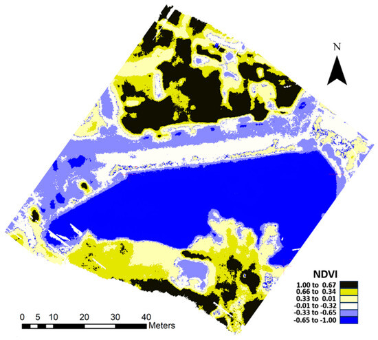 The NDVI (see Equation (1)) is one of the most worldwide-used remote sensing products for vegetation assessment [47]. It takes values from −1 to +1 [48]. A decrease in “greenness” (values closer to zero) reflects vegetation degradation. The NDVI was produced from the NGB images by utilizing the AgroCam tool and the online software OpenDroneMap [49]. OpenDroneMap is written in Python 3 [50].