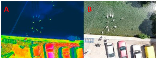 A comparison between (A) a thermal and (B) an RGB image. The water has a lower temperature than its surroundings. Wildlife is also depicted. Vehicles have a higher temperature because of their metallic structure. The specific image was captured on 5 October 2022 (mean air temperature of 15.9 °C). The temperatures were detected in real time during the flight.