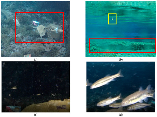 Underwater captured images by the UUV showing: (a) litter in the red rectangle; (b) the old ruins of Agia Varvara church in the red rectangle and the presence of wildlife in the yellow square (legs of a duck); (c) litter and fish; (d) a close-up of curious fish, specifically Phoxinus strymonicus.