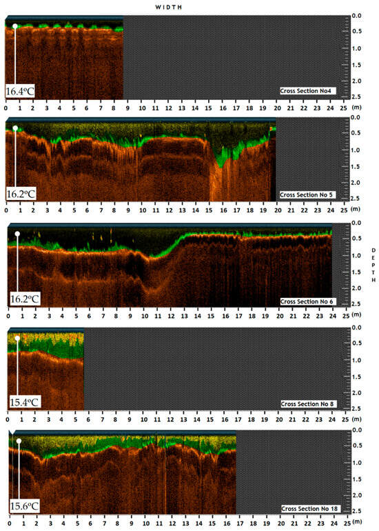 The five cross-sections’ images are based on the sonar device. These locations were selected for the potential placement of the litter trap based on the GPS tracker. Specifically, these are the locations where the miniature boat stopped during its flowing route. The water temperature was also recorded by the sonar device. The five images depict the width and depth in meters, the presence of vegetation in green, the stream bed in orange, and the water depth in black.