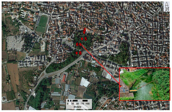 The five opportunity sites for the installation of the litter trap in Agia Varvara Park. Cross-sections 5 and 6 were optimal. The litter trap was installed in cross-section 6, as can be seen in the inset photo.