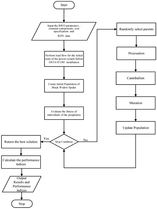 The application of the BWO algorithm for SC allocation is shown in the flowchart in Figure 2. Based on the rules and steps of the BWO, the algorithm is implemented for DSTATCOM allocation as follows: