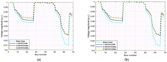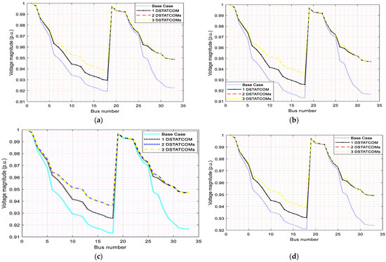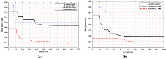 Ref. [25] has proposed a cuckoo search algorithm (CSA) for optimal allocation of DSTATCOM, intending to minimize power loss considering industrial, residential, and commercial loads. A novel modified grey wolf optimization (MGWO) has been utilized for DSTATCOM allocation to reduce power loss and cost due to energy loss [26]. An improved bald eagle search (IBES) algorithm has been used to solve the problem of loss reduction and voltage profile improvement considering different types of load modeling [27]. Ref. [10] proposed a discrete-continuous codification of the Chu–Beasley Genetic Algorithm to address the DSTATCOM allocation considering the annual operating cost of the RDN. Ref. [28] has presented an improved bacterial foraging search algorithm (IBFA) for DSTATCOM allocation to minimize power loss and improve voltage profile and stability. Ref. [29] proposed the ant lion optimization (ALO) to solve the problem of DSTATCOM allocation based on the cost of energy purchased from the substation.