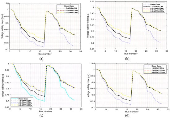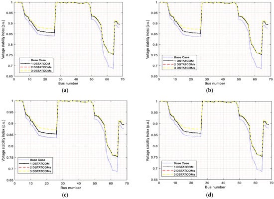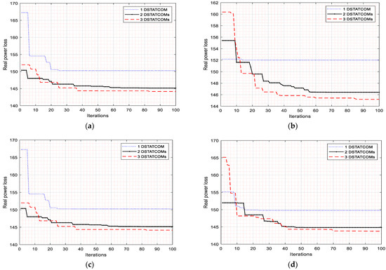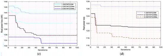 Cost-based optimal allocation of DSTATCOM was carried out using a differential evolution algorithm (DEA) [19]. Ref. [20] has presented an imperial competitive algorithm (ICA) for the optimal allocation of DSTATCOM. In [21], a combination of particle swarm optimization (PSO) and a general algebraic modeling system (GAMS) was used to obtain an optimal allocation of DSTATCOM under load variation and growth scenarios to improve the cost of energy savings. In [8], the whale optimization algorithm (WOA) was used for sizing, while the location of the DSTATCOM was obtained using the voltage stability index. A gravitational search algorithm (GSA) has been proposed for DSTATCOM allocation for power loss reduction, voltage profile improvement, and annual energy saving [22]. Ref. [23] has proposed a voltage stability index and bat algorithm to solve the problem for different load levels. In [24], a new voltage stability index was proposed for the siting of DSTATCOM, while the bat algorithm was utilized for its sizing.