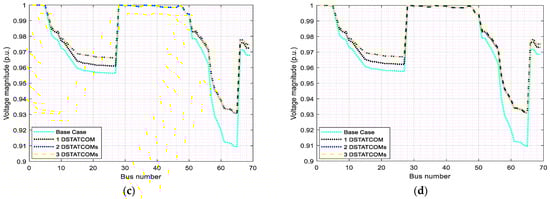 Authors in ref. [30] have performed the simultaneous allocation of DSTATCOM and photovoltaic DG in RDNs at different loading conditions using several hybrid optimization methods that combine the firefly algorithm (FA) with various acceleration coefficients PSO algorithms. The work considered a multi-objective function consisting of power loss, short circuit, voltage deviation, net saving, and environmental pollution. In [31], a Light Search Algorithm (LSA) was proposed for the simultaneous placement of DSTATCOM and Distributed Generation (DG) in the RDNs for minimizing power loss and total voltage deviation (TVD), as well as maximizing the voltage stability index (VSI). Ref. [32] solved the DSTATCOM allocation problem alongside DG penetration using a student psychology-based optimization (SPBO) algorithm. A multi-objective framework was utilized in the work with a real power loss index, bus voltage variation index, voltage stability index, and system annual cost minimization index.