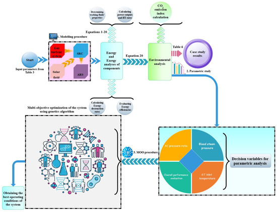 Cao et al. [18] evaluated and parametrically studied a multi-generation plant using a solar gas turbine with biomass fuel from four perspectives. Combustion products from the gas turbine passed through an SCO2 cycle heater followed by a heat recovery steam generator; then, they were discharged to the atmosphere. The analyses demonstrated that, although it did little to reduce environmental emissions, using solar energy significantly enhanced the performance of the system. Increasing the number of mirrors in the solar tower boosted the system’s total cost rate while decreasing its net power and exergy efficiency. Also, the pressure ratio of the gas turbine cycle’s compressor had a direct relation with efficiency, cost rate, and unit cost of product. Nazari et al. [19] thermo-economically assessed and optimized a trigeneration system consisting of an ORC, a gas turbine cycle with external combustion, and an absorption refrigeration cycle. The gas turbine cycle preheated the air entering the turbine in a heat exchanger using solar energy. Based on the case study results, the system’s first and second law efficiencies were reported as 55.5% and 20.3%. Moreover, the exergy efficiency was improved by 9% using multi-objective, multi-verse optimization, while the overall cost rate was reduced by 6%. Diyoke et al. [20] assessed two configurations of multi-generation systems in Nigeria. The combustion products exiting the gas turbine subsystem were used for the first configuration to heat water and for the second configuration to supply directly the heat required for the absorption refrigeration system generator. The overall energy efficiencies for both configurations were found to be about 60%, almost equal to the energy efficiency of the standard recuperated cogeneration system, while both configurations emitted 30% less carbon dioxide than the conventional cogeneration system.