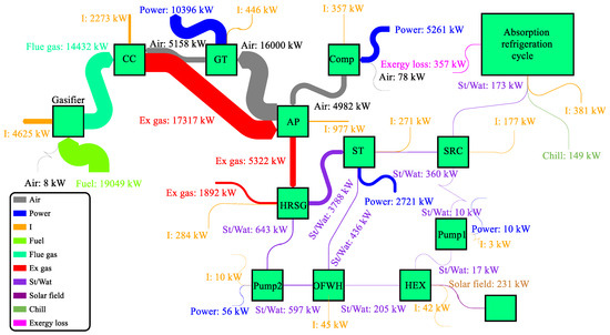In Figure 4, a Grossman diagram is presented for the cogeneration system, showing component exergy destruction and flow rates.