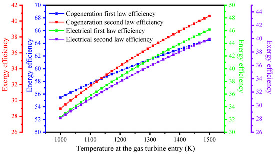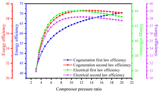 Influence of pressure ratio on the energy and exergy efficiencies of power generation and cogeneration systems.