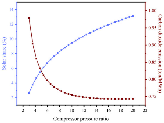 Influence of compression ratio on the carbon dioxide EI and the contribution of solar energy to biomass fuel energy.
